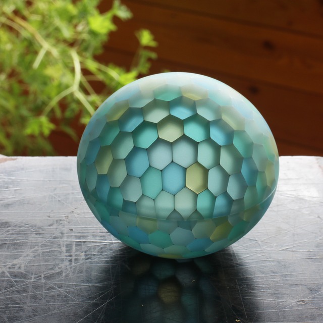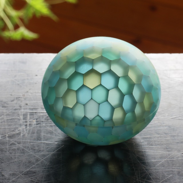 珠箱 ハニカム(大) No.TH-L3 サイズ 高さ7.1cm 径8cm 青・緑系をランダムに配置し、黄色をアクセントにした配色。 【ハニカムシリーズ】 六角形のハニカム(蜂の巣)模様の蓋物。 外側はすりガラスで、内側はガラスらしい透明感があります。 窓際や後ろから光の当たる場所に置くと、内側がふんわりと光って見えます。 板状のガラスを曲げて半球状にしたものを削って蓋物に仕上げています。 パーツ作りから何段階もの工程を必要とし、時間をかけ丁寧に制作しています。 【珠箱について】 ガラスの蓋物の制作は、学生のことから続けている私のライフワークです。 「珠」には美しいもの・大切なものを例えていう語という意味があります。 美しい感情、大切な心をしまっておく存在であるように願いを込め、「珠箱」と命名しました。 『Tamabako honeycomb』 No.TH-L1 size H 2.8 inch W 3.1 inch A color scheme in which blues and greens are randomly arranged and accented with yellow. 【Honeycomb series】 The box is made by bending a sheet of glass into a hemispherical shape and shaving it. The outside is frosted glass, and the inside has a glass-like transparency. If you place it near a window or in a place where it receives light from behind, the inside will look soft and shiny. It requires several stages of processes from making parts, and it is carefully produced over time. 【About Tamabako】 Creating glass boxes has been my lifework since I was a student. "Tama" has the meaning of a word that compares beautiful and important things. "Hako=bako" means box. I named my work "Tamabako" with the hope that it will be a presence that preserves beautiful emotions and precious hearts.