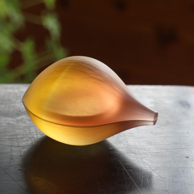 珠箱 たね No.TS-L11 サイズ 高さ 5.1cm 横幅 8.3cm 奥行き 6cm 紅茶色とアンバー色 *小さな泡が入っています。 【たねシリーズ】 2~3色の色ガラスを溶かし合わせた塊から削り出して形を作った蓋物。 最終的な形は、ガラスを削りながら決めています。 外側はすりガラス状に仕上げており、見る角度によって色が混ざり合い見た目の変化を楽しむことができます。 内側は透明感のある仕上がり。 窓際や後ろから光の当たる場所に置くと、内側がふんわりと光って見えます。 ガラスに厚みを持たせるため内側の空間は小さめですが蓋にも空間があるので、指輪やお香など を入れることができます。 【珠箱について】 ガラスの蓋物の制作は、学生のことから続けている私のライフワークです。 「珠」には美しいもの・大切なものを例えていう語という意味があります。 美しい感情、大切な心をしまっておく存在であるように願いを込め、「珠箱」と命名しました。 『Tamabako Tane』 No.TS-L8 size H 2 inch W 3.3 inch D 2.4 inch Tea and amber colours * Contains small bubbles. 【Tane 】 A piece made by shaving a mass of two or three colors of colored glass melted together. The final shape is decided while shaving the glass. The outside has a frosted glass finish, and you can enjoy the change in appearance as the colors mix depending on the viewing angle. The inside has a transparent finish. If you place it near a window or in a place where it receives light from behind, the inside will look soft and shiny. The inner space is small to give the glass thickness, but the lid also has a space, so you can put rings, incense, etc. 【About Tamabako】 Creating glass boxes has been my lifework since I was a student. "Tama" has the meaning of a word that compares beautiful and important things. "Hako=bako" means box. I named my work "Tamabako" with the hope that it will be a presence that preserves beautiful emotions and precious hearts.