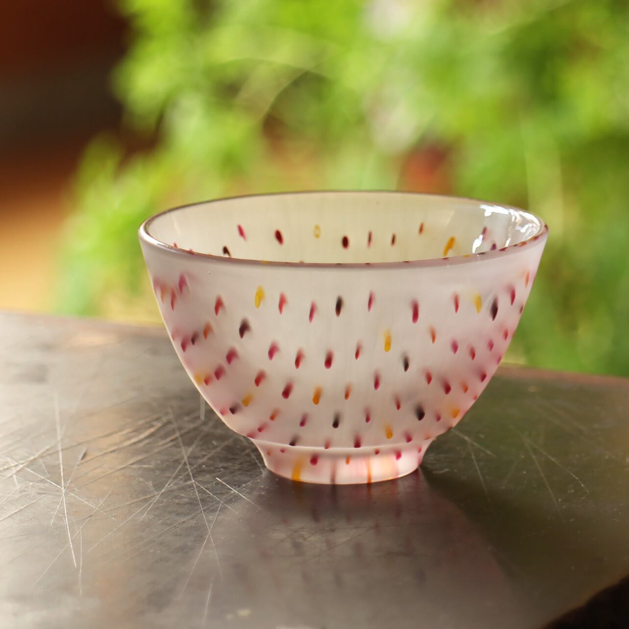 外側はすりガラス状でサラサラとした感触と柔らかなガラスの色彩を楽しむことができ、内側はガラスらしい透明感のある質感です。
