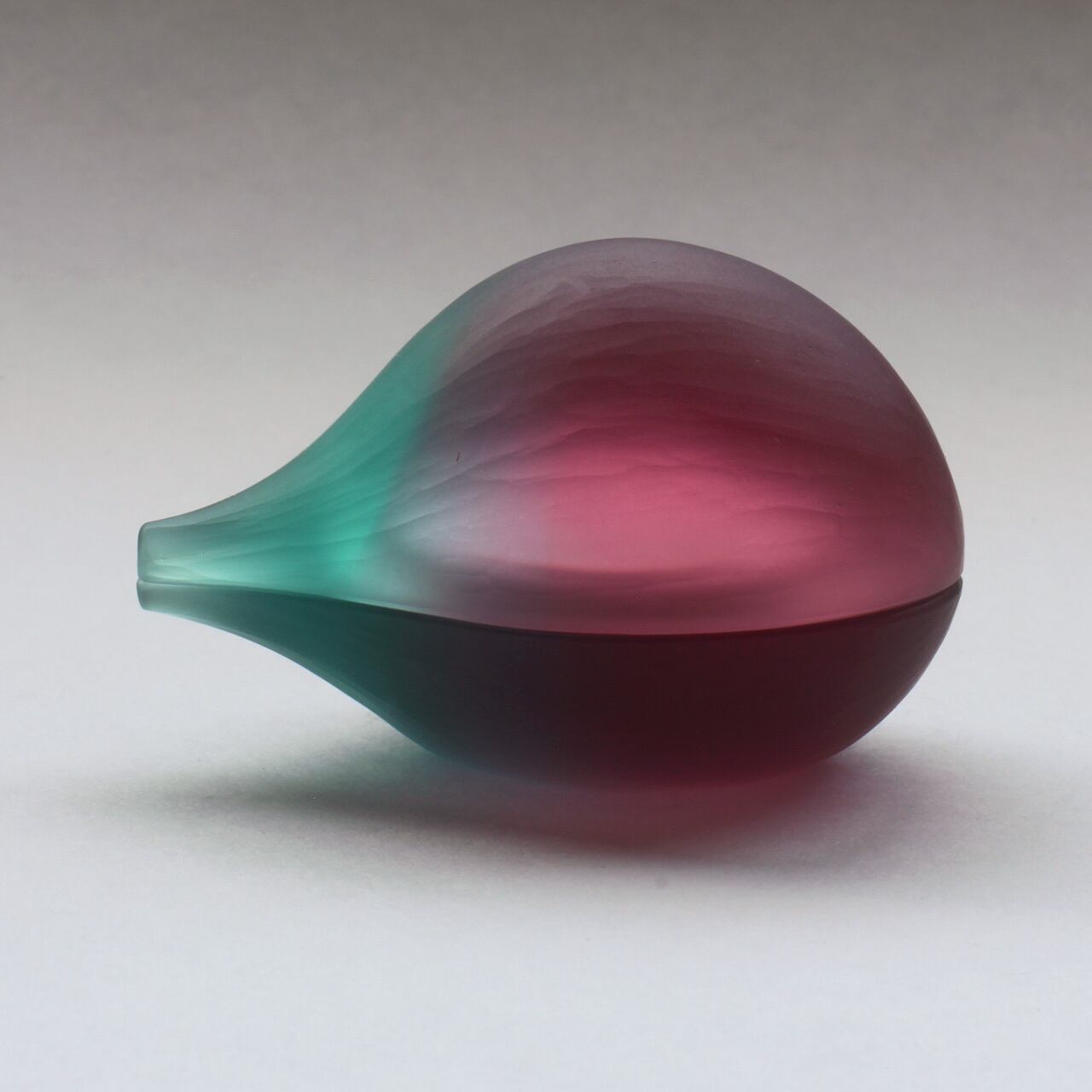 2~3色の色ガラスを溶かし合わせた塊から削り出して形を作った蓋物。