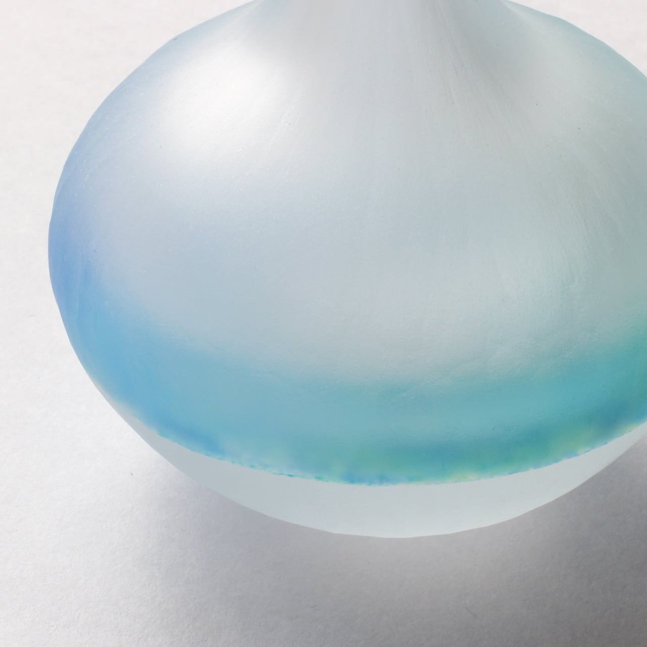 外側は削り跡を残したすりガラス仕上げの為、透明のガラスの間に挟み込んだ数種類の青色、白色が滲んだようにガラスに広がって見えます。